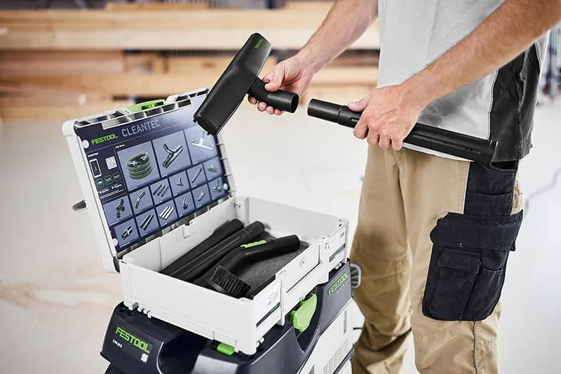 Our smooth and flexible suction hoses offer optimal dust extraction. They prevent tilting and protect the surfaces. Our special hose with integrated plug it-cable offers you a high level of convenience. Dust extraction on various different surfaces, large areas or hard-to-reach spots? No problem with our cleaning sets. Securely stowed and quickly accessible in a Systainer. This saves you time when cleaning and leaves a clean impression with your customers.