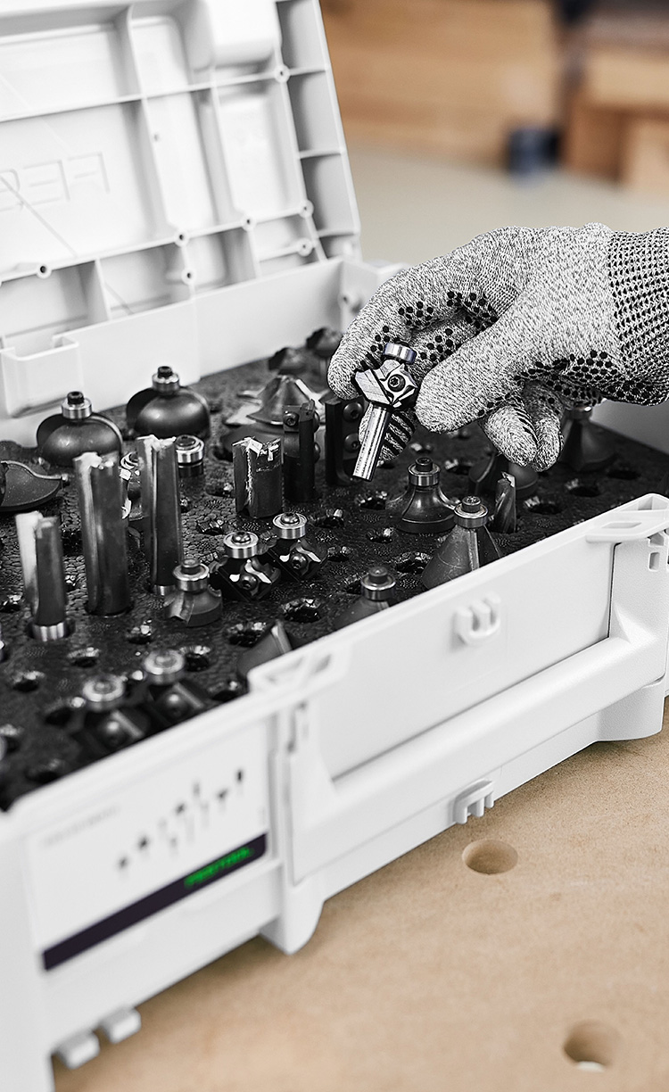 Whether flush, curved, as a groove cutter or with special profiles – we have the perfect router for your application. Our routers have the sharpest cutting edges. And once the first cutting edge on the indexable insert router bit goes blunt, simply turn the tool around to continue using it for longer! The routing tools are well protected in the handy Systainer³ with individual slots or the router bit box. Always clearly organised and in easy reach.
