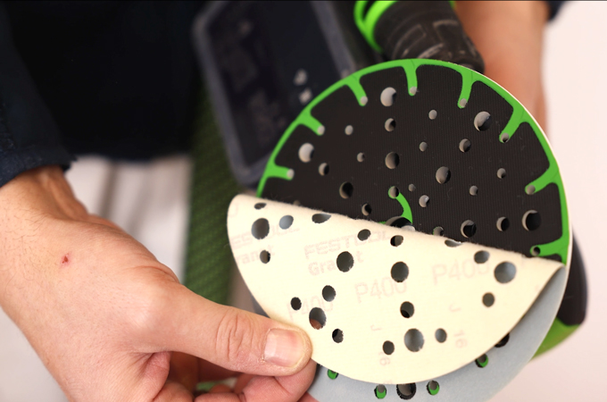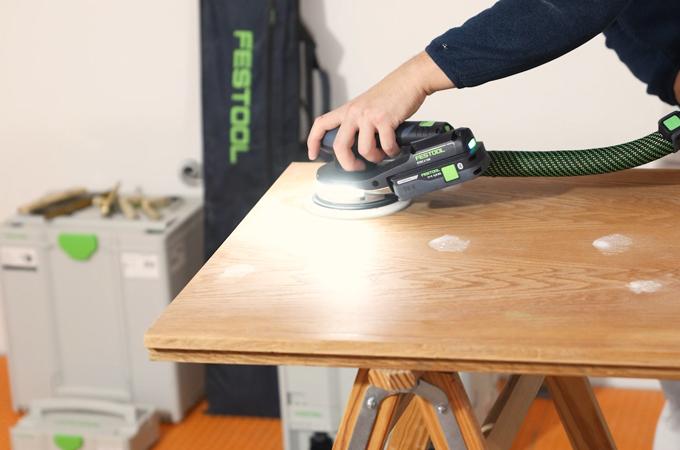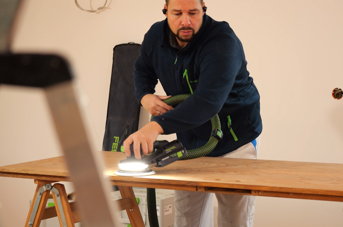 Now we sand the door. To do this, we use an Eccentric sander - ideally the ETSC 2 150 - to achieve an even and high-quality surface finish. We recommend using Granat universal sandpaper with a grit size of P180 as the abrasive. This ensures that both sides of the door leaf are sanded evenly. Thanks to the integrated light, any unevenness or damage to the surface of the door can be recognised directly and marked with a Pin if necessary.