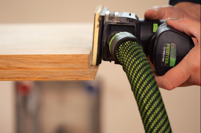 An orbital sander is recommended for sanding the rebates on the door leaf. For example, an RTSC 400 can also be used here with a grit size of P180. The rebates can be sanded more easily thanks to its perfect fit. Hard-to-reach areas are reworked with a Manual abrasive. After sanding, dust should be removed from the door. A suitable vacuum cleaner with a Suction brush is suitable for this.