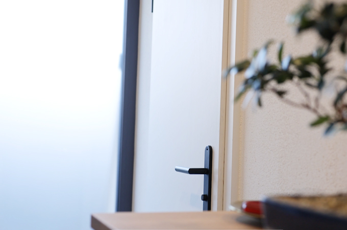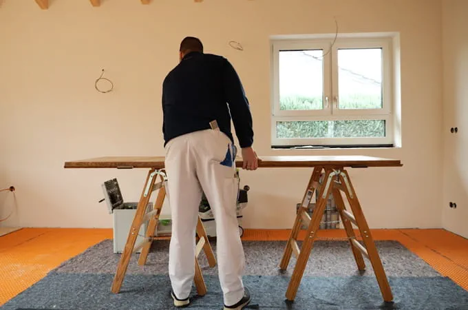 The first step is to check the door. Is there any visible damage or is the door rubbing against the floor? If there are any problems, we recommend adjusting the door to the floor height. The floor height often changes during renovations - whether due to underfloor heating or a new floor covering. We therefore measure the new height at the door hinges and shorten the door leaf to the right height using the Plunge-cut saw and Guide rail.
