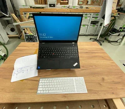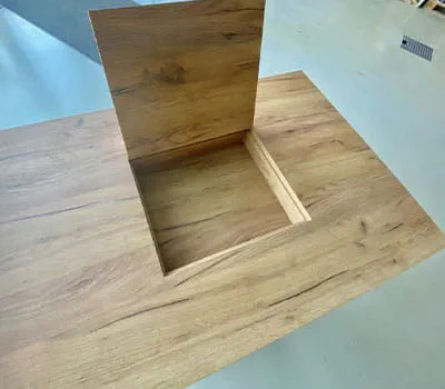 Due to the lack of space or else for decorative purposes, it can be of advantage to create a storage space that can be cleverly concealed and used relatively easily in/under the table or behind a wall. In our case, it is a table made from veneered chipboard. Here, the desired lid size must be cut on both sides so that it's splinter-free, as it's being used again right there in the form of an opening. So you get a clean look and the lid is barely apparent.