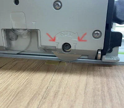 Directly afterwards, we deactivate the main saw blade with the lever at the top of the saw by blocking it.