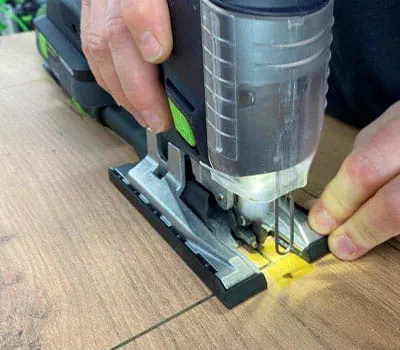 The corners must still be cut through completely now. To prevent splinters here too, please make sure not to use a wider jigsaw blade than the circular saw blade. Pay attention to settings on the saw. Install the splinter guard and switch off the pendulum stroke.