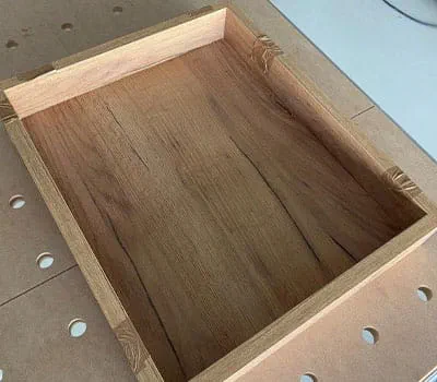 In our case, we're working with a veneered plate. This must be fixed so that it's elevated on the work bench, so that we don't cut into it (see figure)