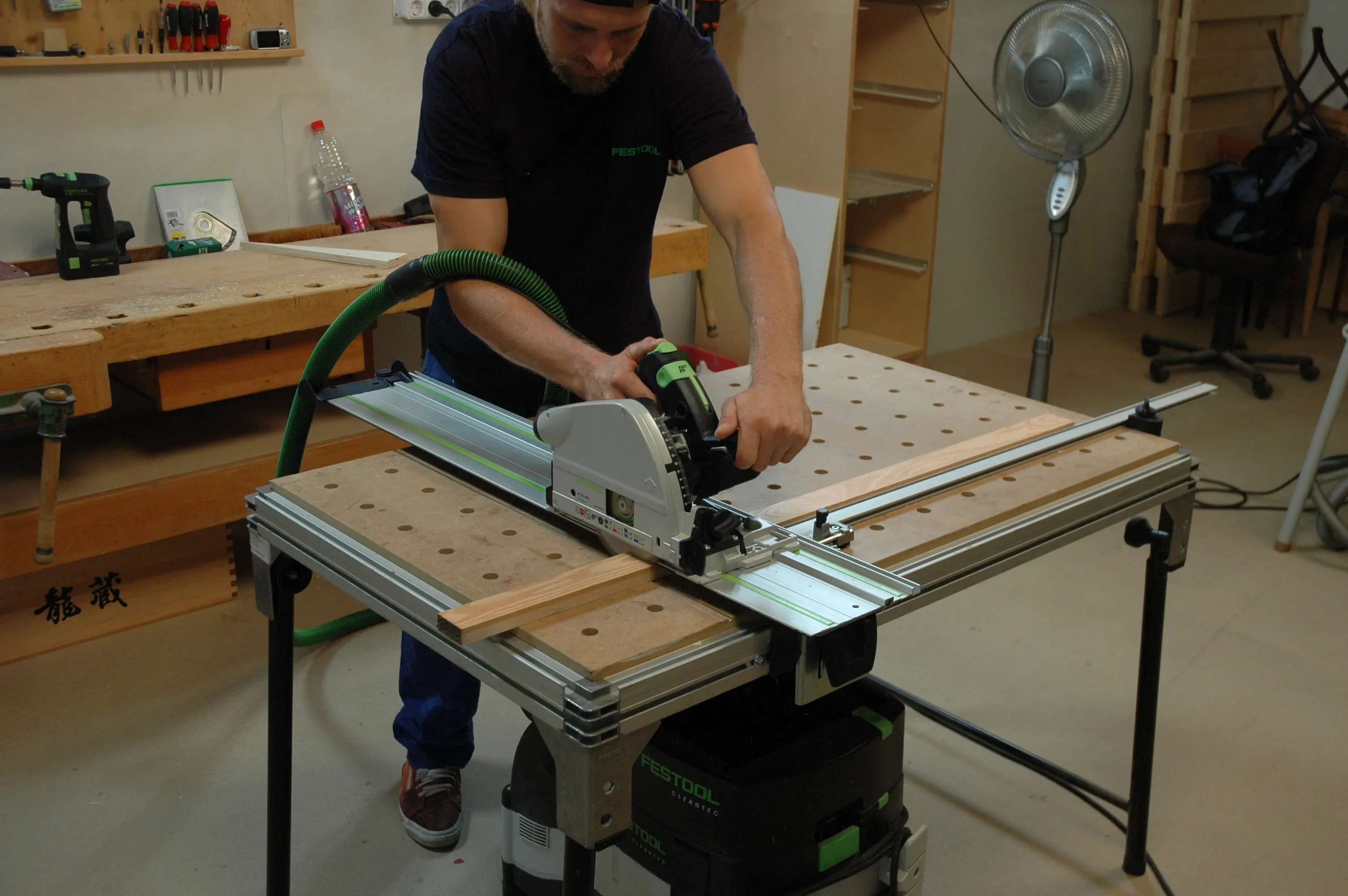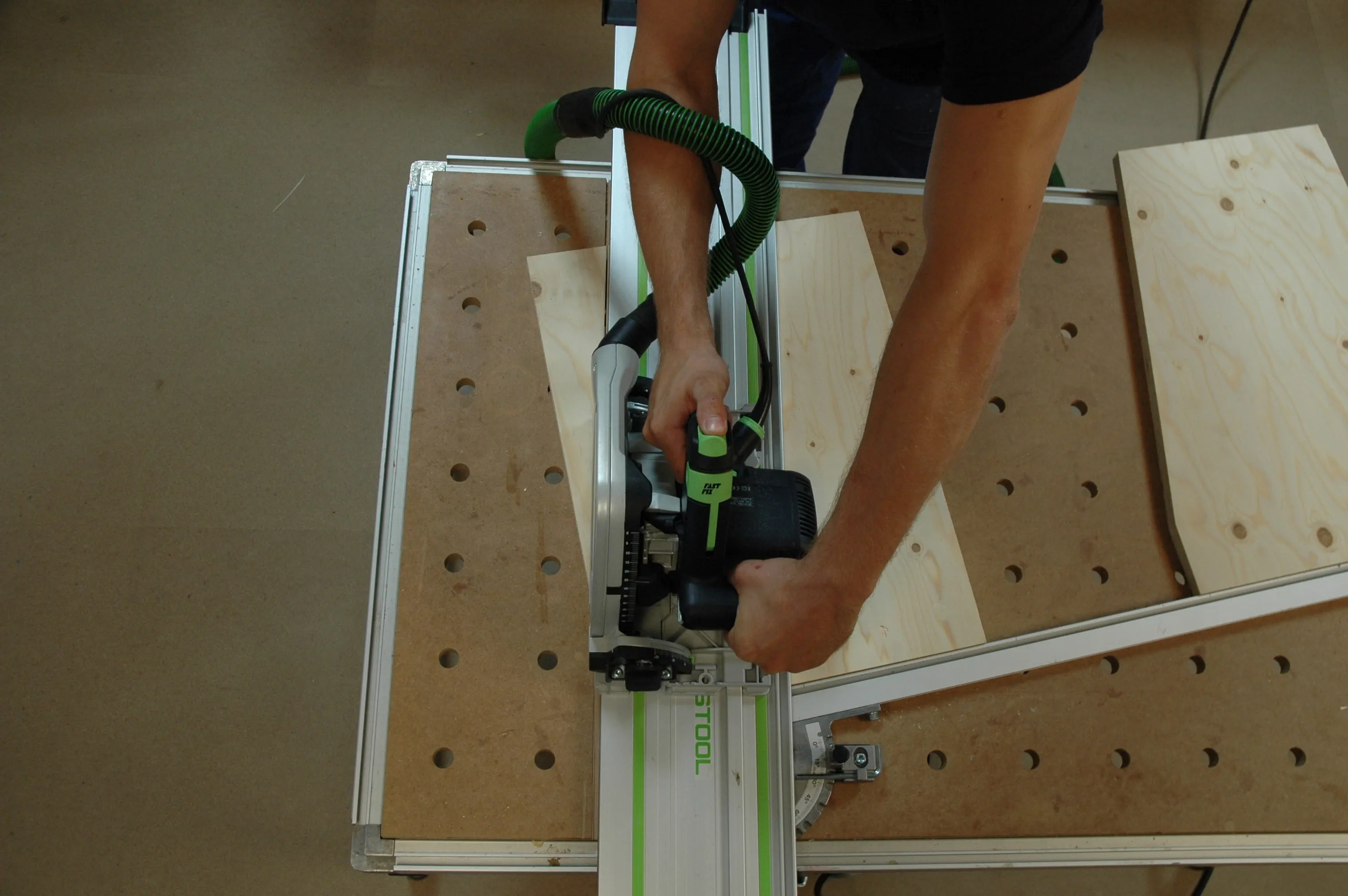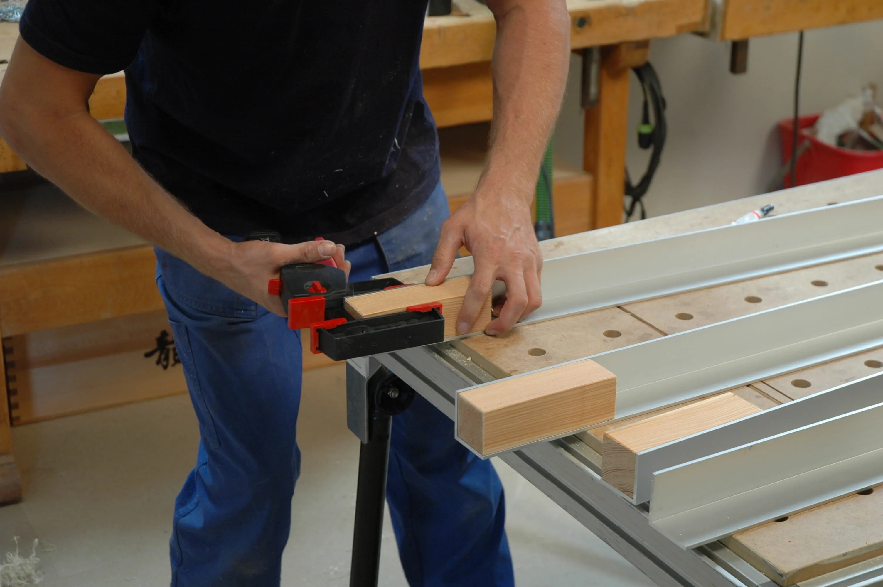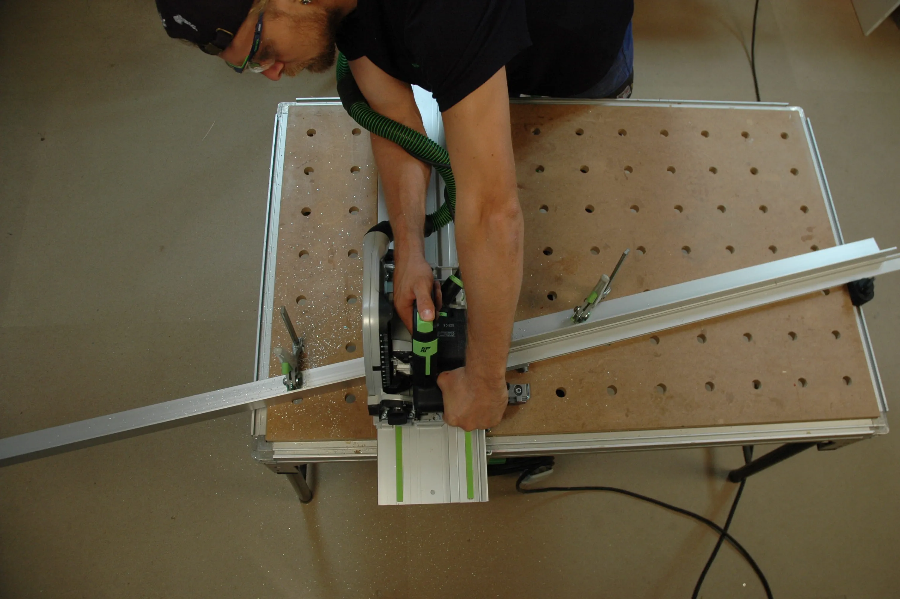 Using the multifunction table shown in the photo, set the stop rail at an angle and fasten the workpiece to the table. You can also use this to cut out the aluminium profiles for the legs.