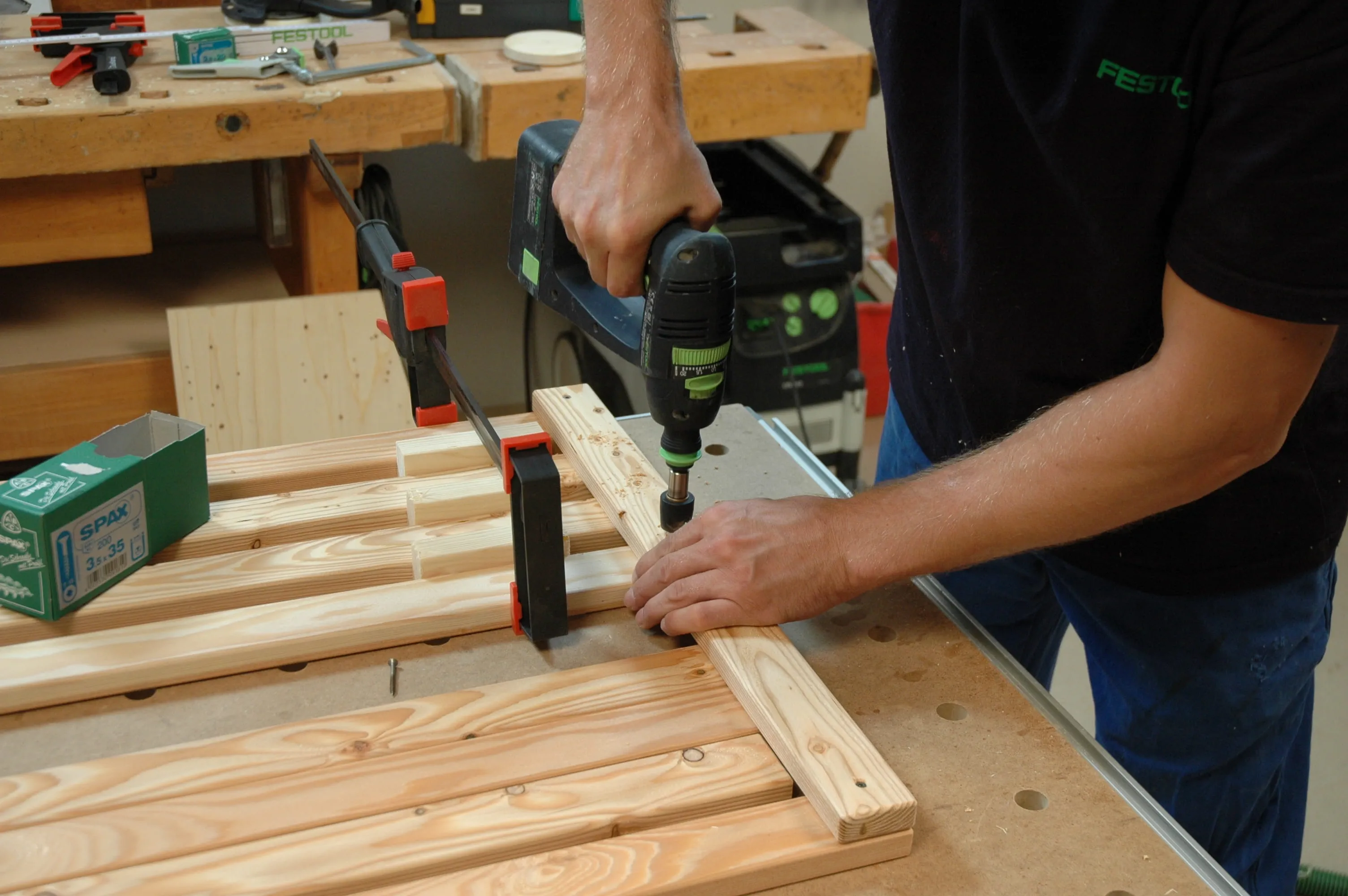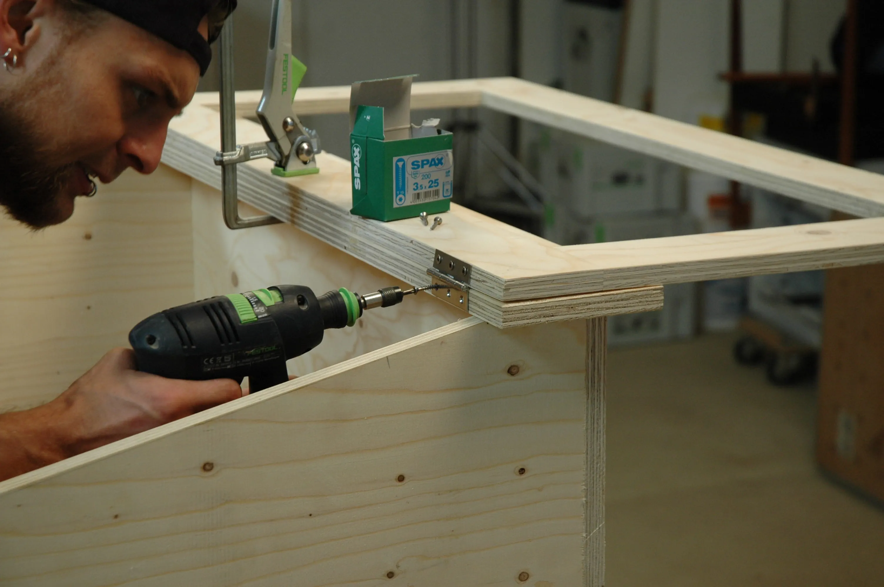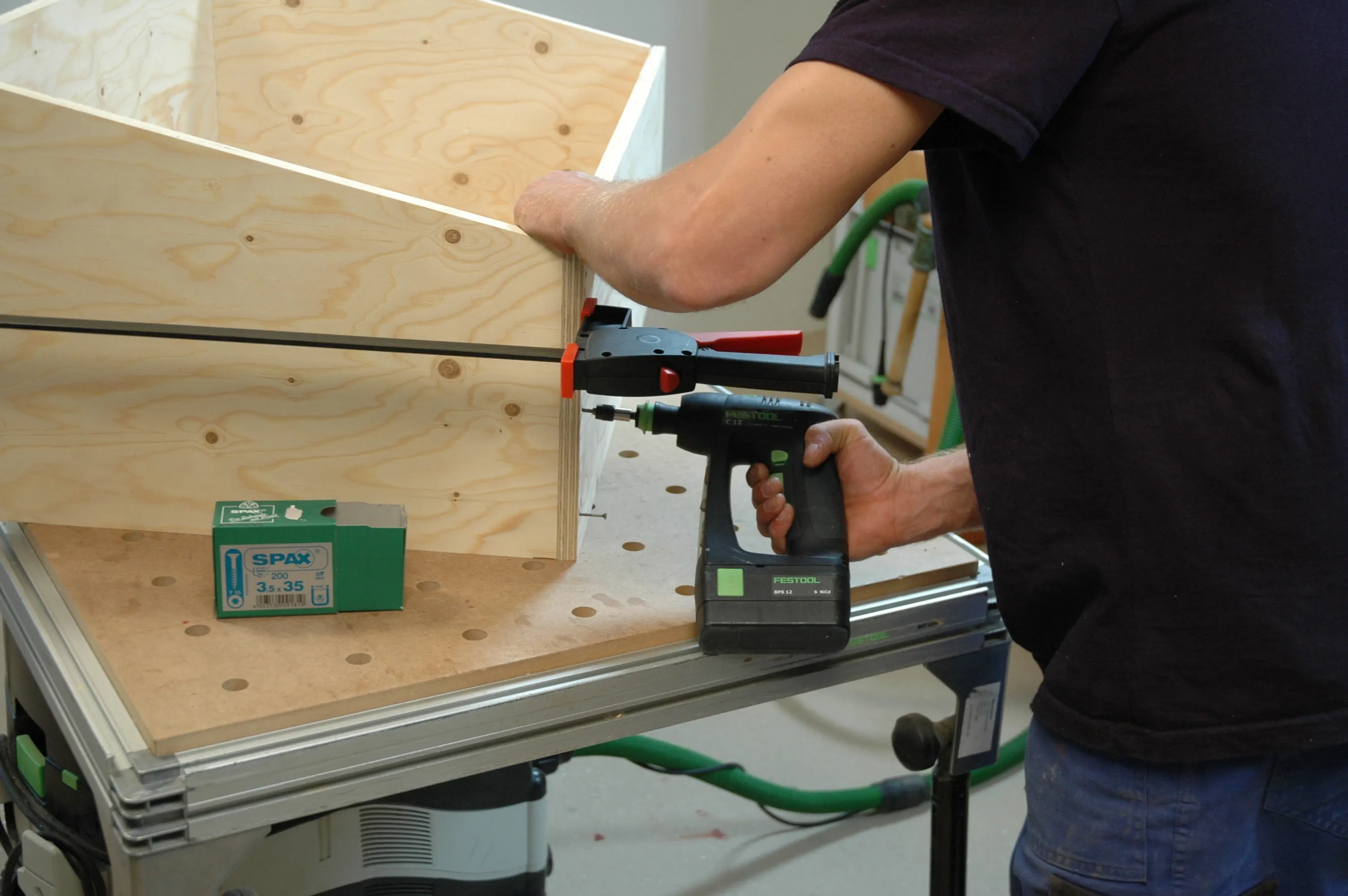 Pre-drill the 3.5 mm diameter for the SPAX screws (3.5 x 35) on the front and back walls (positions 1 and 2). Use clamps to fasten together the four boards that are used to make the box, then check the alignment and screw together.