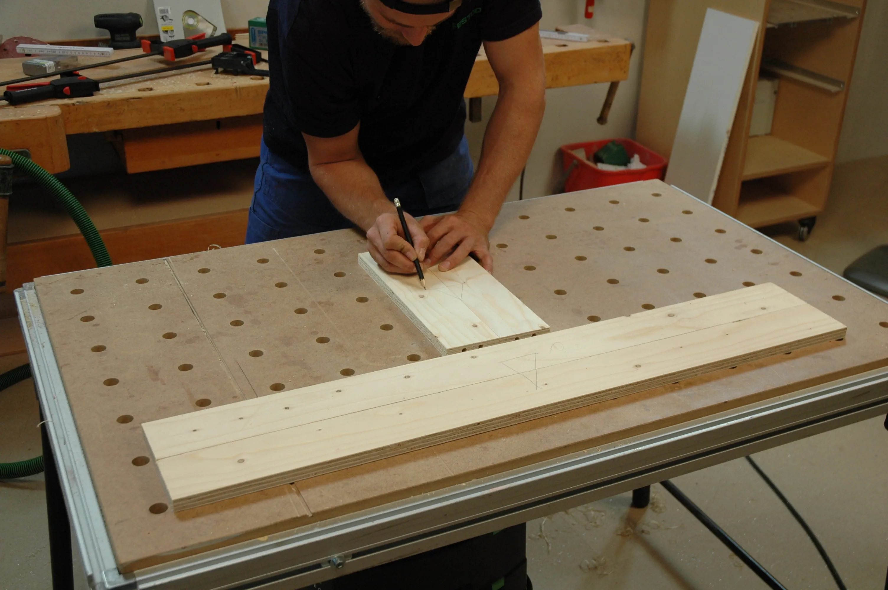 Mark the positions of the individual frame pieces using the carpenter's triangle marking system. First, drill two 8 mm dowel holes (drill depth = half the dowel length + 1 mm) into each of the short narrow edges of the frame pieces (position 6).