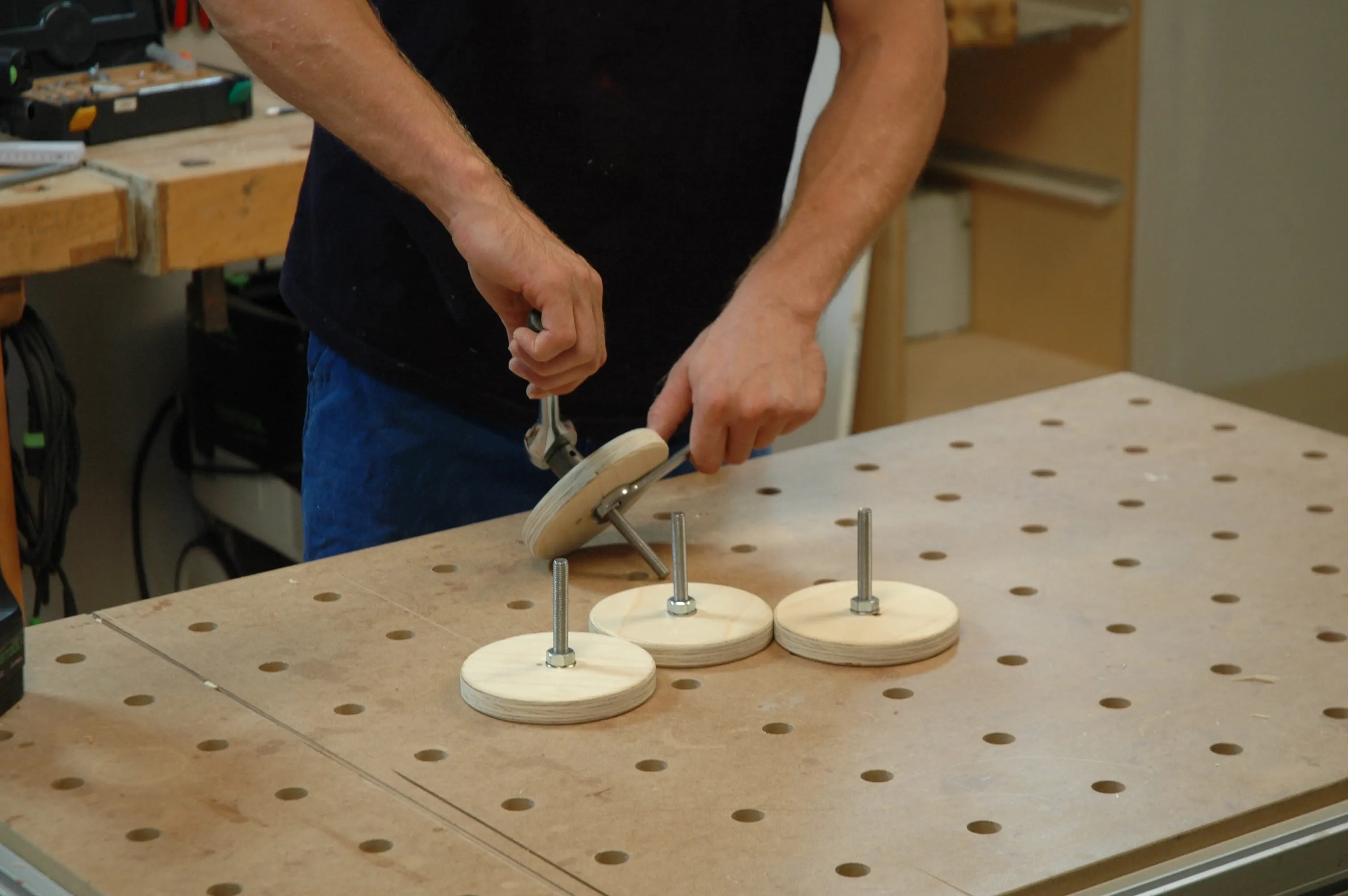 Use a jigsaw to cut round discs (position 16) from plywood to use as the adjustable feet. Deburr the edges with a hand-sanding block. On the underside of the discs, drill a 30 mm hole. The depth should correspond to the head of the machine screw (M10 x 80) and a flat washer.
