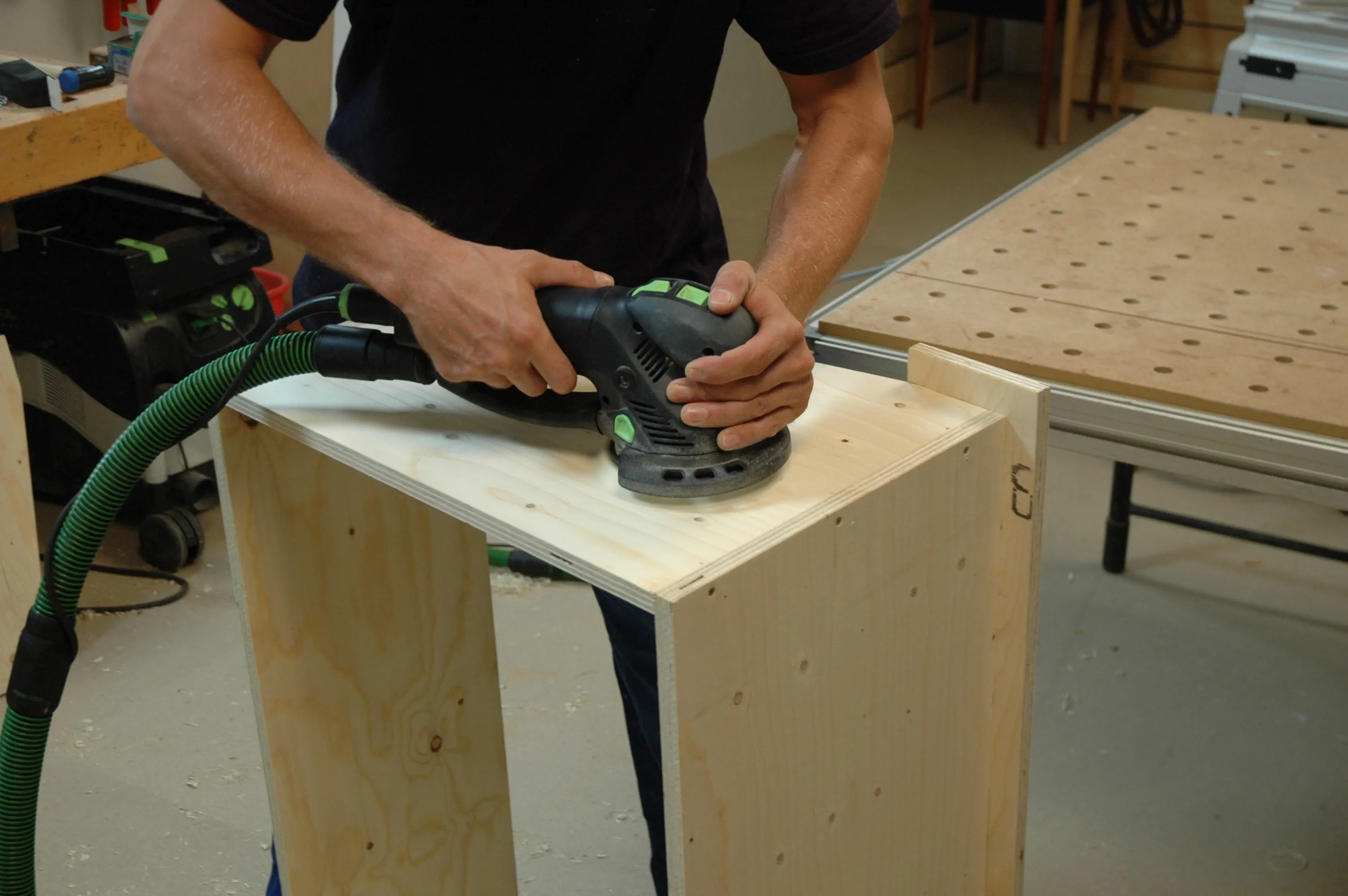 When the glue on the frame is dry, loosen the clamps and use an eccentric sander and P120 grit sandpaper to sand the connections smooth.