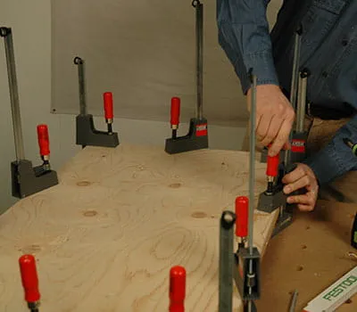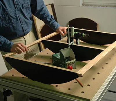 Once the base structure is screwed together, insert the interior panels (positions 2, 7 and 13). Clamp the panels and drill the holes for the screws. Use SPAX screws (3.5 x 20 mm) to screw the panels to the base structure.