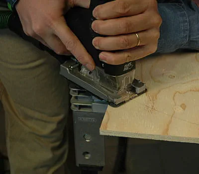 In order to obtain a precise cut edge, change the pendulum stroke setting on the jigsaw to 1. Use a table saw to cut the roof end strips at an angle lengthways. For long cuts in solid wood, it is strictly necessary to use a coarse saw blade. Use the table saw to cut the strips to the correct length.