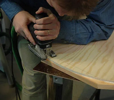 Once both of the gable walls are completely constructed, use a jigsaw to cut the interior panels and the base structure along the curve. Place the gable sides onto the roof beams (position 18) of the roof structure and transfer across the upper curve. Use the jigsaw to cut the roof beams.