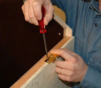 Place the roof onto the kennel and line it up correctly, then mark the position of the hinges. Use a flat drill to mark the bottom part of the hinge onto the outside of the wall. Take the roof away and screw on the hinge. Now, assemble the entire kennel and sand all edges and angles. Dismantle the kennel again and use an eccentric sander to sand all of the external surfaces.