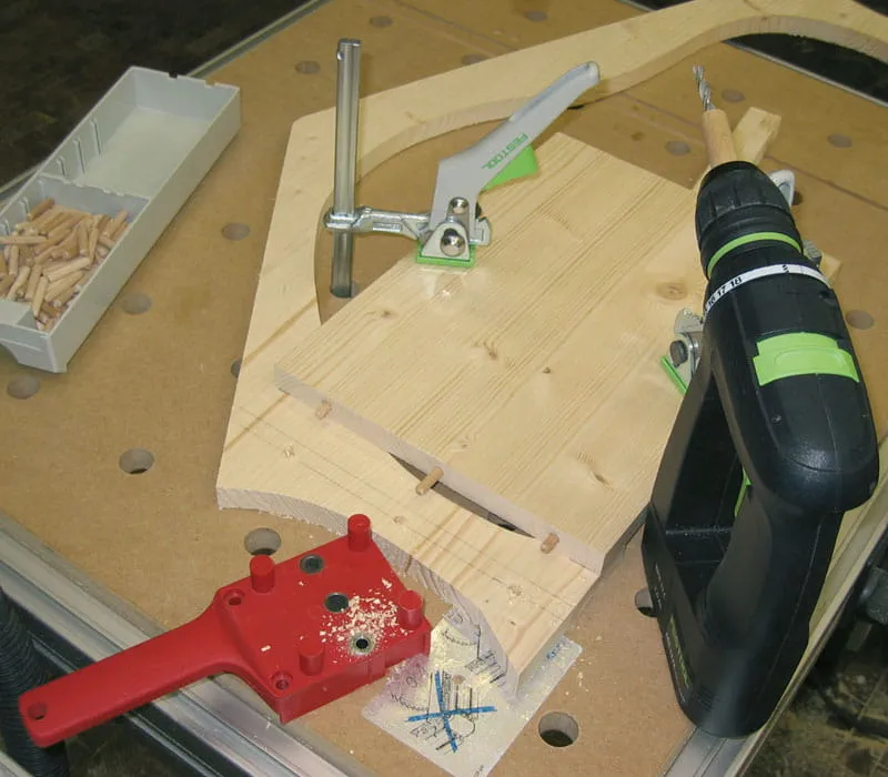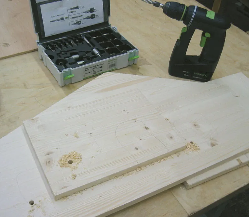 Place the individual stable pieces together and transfer the dowel holes onto the centre line that was drawn earlier. Alternatively, transfer the dowel holes using dowel tips. Dowel (position 8)