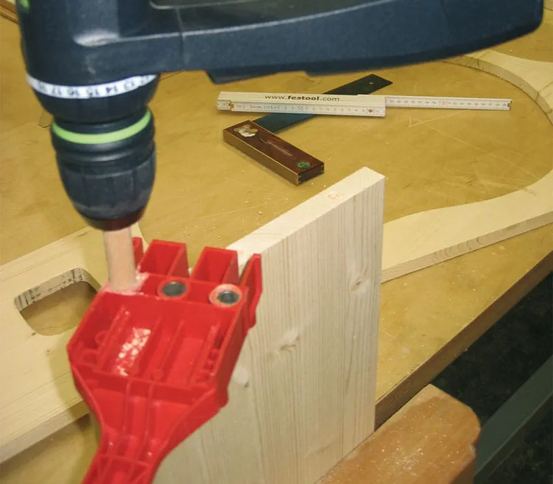 Drill the dowel holes (dia. 6 mm) into the narrow edge of the side walls using a dowel template.